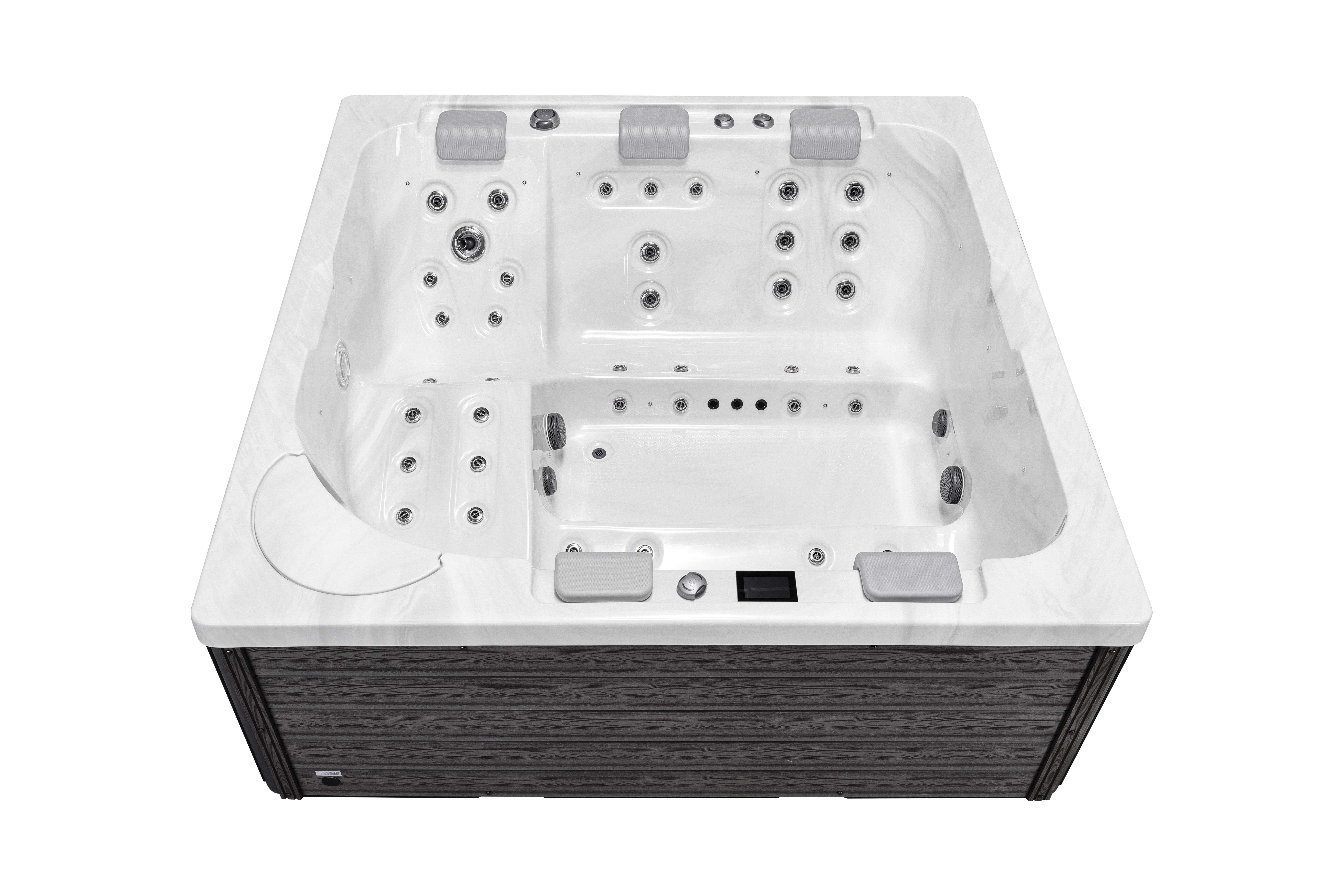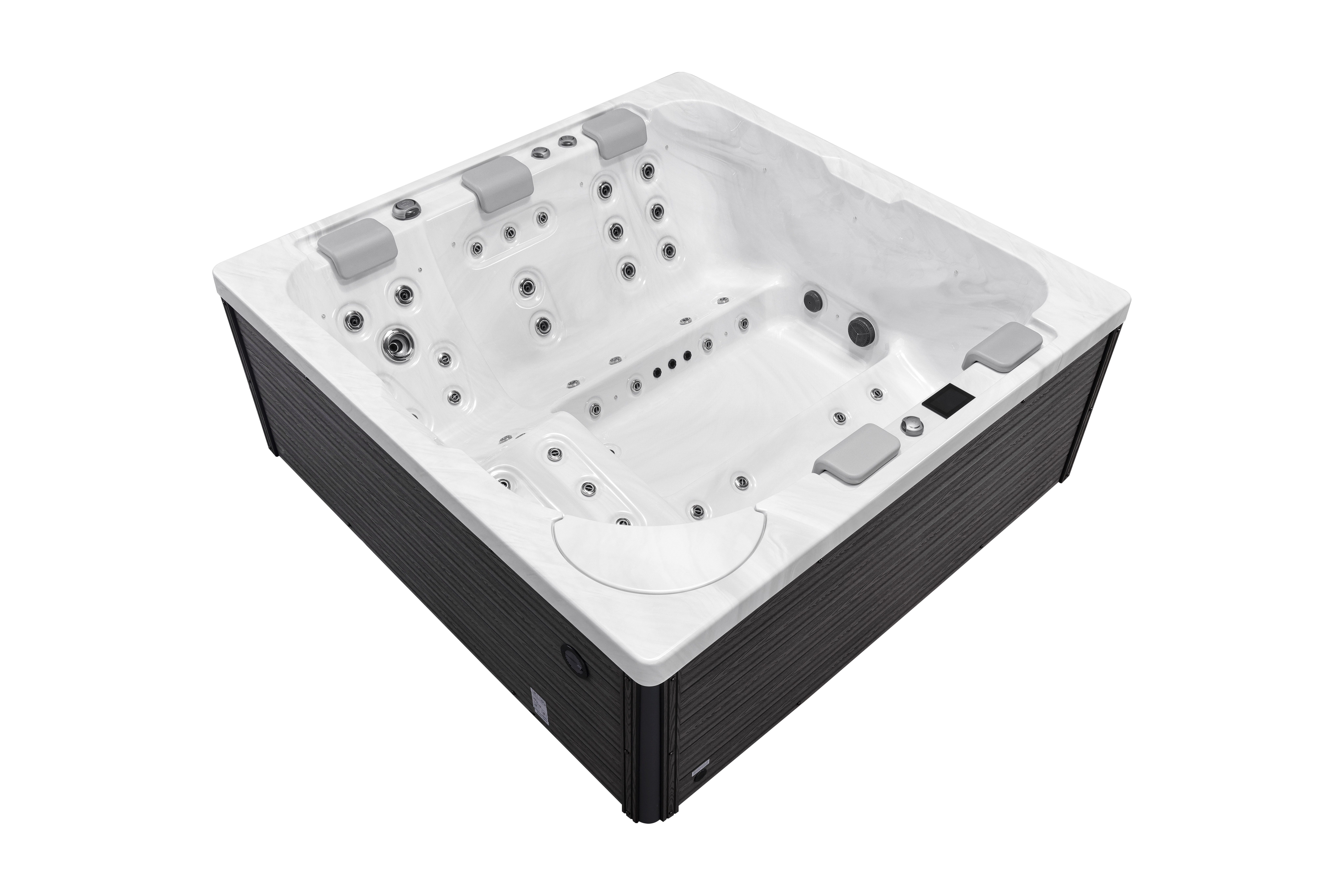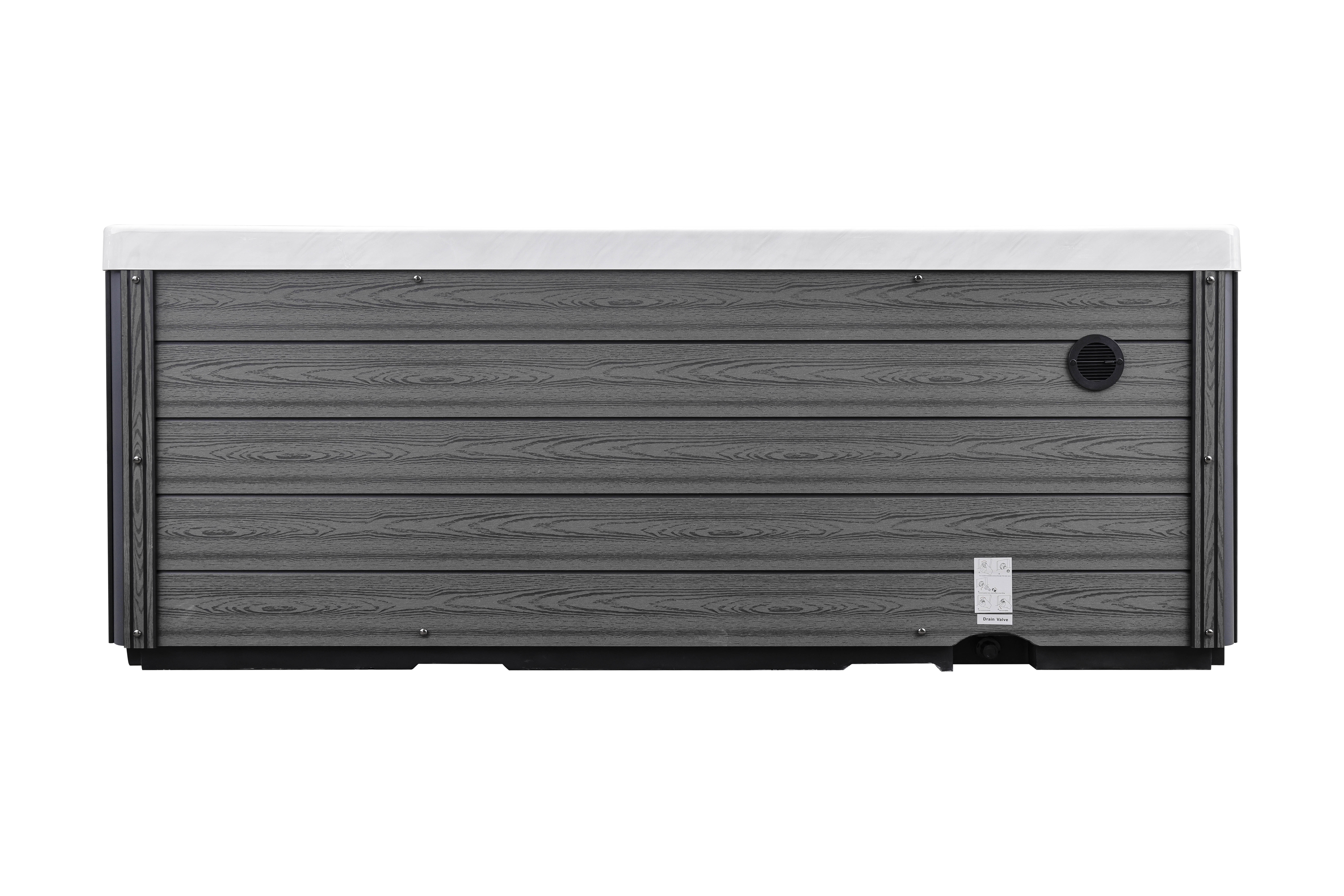 Прочная опорная рама из гальванизированной стали гарантирует устойчивость и долговечность конструкции. Элегантная обшивка из ДПК-панелей не только придает спа-бассейну современный вид, но и устойчива к влаге, перепадам температур и ультрафиолету.